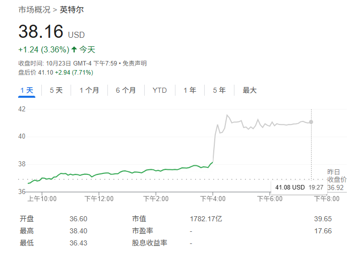 具体而言,英特尔第三季度营收136.5亿美元,同比增加2.8%,高于分析师预期的131.5亿美元;第三季度经调整毛利率40%,市场预估36.1%;第三季度调整后每股收益0.23美元,高于分析师预测的0.01美元,上年同期每股亏损0.46美元。